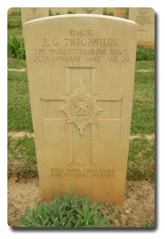 | Notes: | Provost Officer. Worcestershire Regiment. He was born in Monmouthshire and resided in Wiltshire. OC 16 Div Pro Coy 1940. War Diary 78 Div Pro Coy, WO 175/176. 25/1/43 APM 5 Corps killed (Maj Theophilus) by machine gunning from the air. He was the OC 16 Div Pro Coy in March 1940 at Sevenoaks. OC 38 (Welch) Div Pro Coy 3/7/1940. Casualty List (Officers) 1046, North Africa, Died, 25/1/1943. Casualty List (Officers), 1049, Egypt, Casualty should read Died of Wounds, 25/1/1943.Eric George Theophilus. |