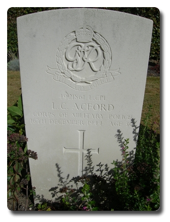 | Notes: | CMP. He was born in Walsall, resided in Staffordshire and formerly served in the South Staffordshire Regiment. 16/12/1944 War Diary WO 171/7825. 16/12/1944, he was killed when the Coy. HQ was hit by a German V2 Rocket killing RSM Southon, L/Cpl Bunce, Duke, Hawkins, Jones, Nisbet, Toyne, Thompson and Yates. Relatives of the dead received £11 each which was collected by the Company. Casualty List 1647, Western Europe, Missing believed Killed, 16/12/1944. Casualty List 1656, Western Europe, previously reported missing believed killed now reported killed in action 16/12/1944, previous List 1647, 16/12/1944. No inscription on gravestone. Leslie Charles Acford. |