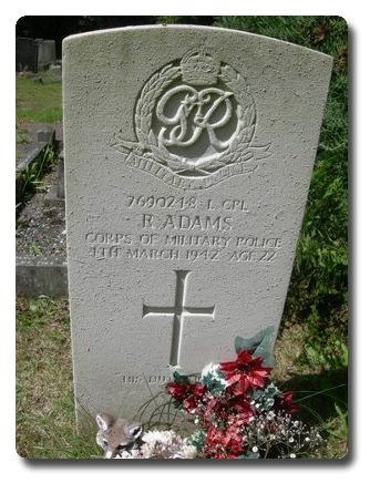 | Notes: | CMP. He was born in Derbyshire and resided in Nottingham. War Diary 2 Div Pro Coy, WO 166/6185. 27/2/1942 Turkdean, L/Cpl Adams R involved in a motorcycle accident, seriously injured, taken to Tewkesbury hospital, parents informed. 4/3/1942 7690248 L/Cpl R Adams died from injuries at Tewkesbury hospital. 8/3/1942 7690248 L/Cpl Adams buried at Mansfield. 10/3/1042 OC attended inquest into death of 7690248 L/Cpl Adams. Verdict accidental death. Casualty List 772/25, Home, Died as a result of an accident, 28/2/1942.5/12/49 He was awarded the Defence Medal, War Medal.Address:- Mr. J H Adams, 89 forest Road, New Clipstone, Mansfield, Notts.Inscription on gravestone: His duty done. Ronald Adams. |