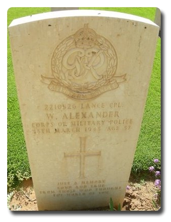 | Notes: | CMP. 1 Armoured Division Pro Coy. Enlisted in the Royal Engineers, 28/2/41 transferred to CMP. 13/3/43 Died. He was born in Motherwell and resided in Wishaw. Name spelt Alexandria in Crozier Roll of Honour. 1 Armoured Division Pro Coy War Diary WO 169/8686. 13/3/42 L/Cpl W Alexander killed in motorbike accident. 21/3/42 Memorial service held. Inscription on gravestone: Just a memory fond and true from those who thought the world of you. Casualty List 1102/2, Tripolitania, Died as a result of an accident, 13/3/1943.12/4/50 He was awarded the 1939-1945 Star, Africa Star with 1 army clasp, War Medal.Address:- Mrs H B Watson, 18 Charles Street, Graieneuk, Wishaw, Lanarkshire. Scotland.William Alexander. |