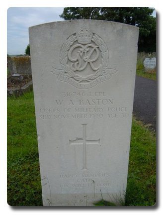 | Notes: | CMP. He enlisted in the Cavalry of the Line, Lancers, and later Royal Norfolk Regiment then CMP. 48 Div Pro Coy. 3/11/40 Died. He was born and resided in Wiltshire. Inscription on gravestone: Happy memories, Cath, Thy will be done. Died as a result of an accident. Casualty List 355/8, Home, died as a result of an accident, 3/11/1940, name spelt Bastin ?7/9/48 He was awarded the 1939 - 1945 Star, Defence Medal, War Medal.Address:- not shownWilliam Alfred Baston. |