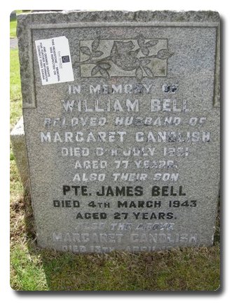 | Notes: | CMP. 20/6/40 enlisted in the Royal Scots Fusiliers, 25/1/41 transferred to CMP. TC. 4/3/43 Died. He was born and resided in Kilmanrock. Casualty List 1093/19, Home, died as a result of an accident. Medal card not found, Inscription on private gravestone: In memory of William Bell beloved husband of Margaret Candlish, died 6th July 1951, age 77 years, also their son Pte James Bell died 4th March 1943, age 27 years, also the above Margaret Candlish. Died as a result of an accident.James Bell. |