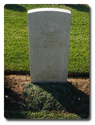 | Notes: | CMP. Enlisted in to CMP. He was born in Antrim and resided in Belfast. War Diary 508 Ind Mobile Pro Coy. WO 169/13282. 12/12/1943, 15.15hrs, 1 Cpl fatally injured in traffic accident. 13/12/1943, 08.30 hrs enquiries into fatal accident. 15.00hrs funeral of Cpl Blacker at Ramleh Cemetery. Casualty List 1326/1, Middle East, Died as a result of an accident, 12/12/43.Medal card not found.David Blacker. |