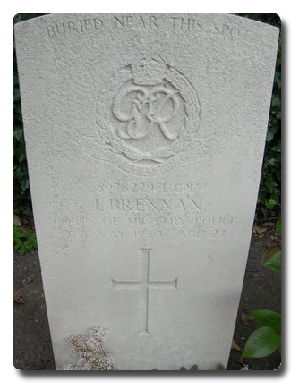 | Notes: | CMP. Enlisted in the Royal Inniskilling Fusiliers, transferred to CMP.He was born in Eire and resided in Belfast. Casualty List 234/7, BEF France, Killed in Action, 31/5/1940. Casualty List 594/15, List 234. France, Sgt. Killed in Action, rank should read Pte.23/11/49 He was awarded the 1939- 1945 Star, War Medal.Address:- Mrs. K M Bover, 118 Alma Street, St. Thomas, Ontario, Canada.No inscription on gravestone.John Brennan. |