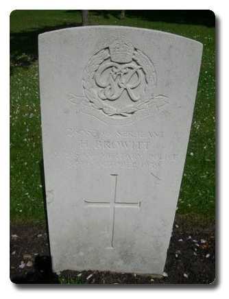 | Notes: | CMP. He was born in Derbyshire and resided in Derby and formerly served in the Grenadier Guards. Stationed in Bordon Camp with the CMP. No inscription on gravestone. London Gazette 34812 , 15/3/1940 HAROLD ARTHUR (otherwise Harold) BROWITT late of Military Police Barracks, Bordon, Hampshire died at Aldershot on 30th October 1939. His Mother is requested to apply to the TREASURY SOLICITOR (B.V.), Storey's Gate, London, S.W.I. (Estate about £90). Casualty List 41, Home, Died, 30/10/1939.Harold Browitt.Newcastle Journal 31/1/40, War Office Casualty List of Officers and Men who have Died up to 31/12/1939.Browitt Sgt H. Also shown in the Scotsman, 31/1/40. |