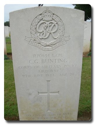 | Notes: | CMP. 6 Airborne Div Pro Coy. Enlisted in the Royal Engineers, transferred to CMP. 9/6/44 Died. He was born in Oxfordshire and resided in Wiltshire. War Diary 6 Airborne Div Pro Coy, WO 171/436. 8/6/44 7 TP's (traffic posts) still Working, L/Cpl Bunting killed by shrapnel. 2/7/44 short service held and headstones erected at Pegasus Memorial Burial Ground at Ranville Cemetery for Sgt Scott, Cpl Henderson, and L/Cpl Bunting. His father was killed in action 13/10/15 in France. Inscription on gravestone: To live in the hearts of those we love is not to die. This was the first formation to land on D Day, 6/6/1944. Casualty List 1488/15, North West Europe 1488, Killed in Action, 9/6/1944.7/9/49 He was awarded the 1939-1945 Star, France & Germany Star, Defence Medal, War Medal.Address:- 36 Bridge Street, Osney, Oxfordshire.Clarence George Bunting. |