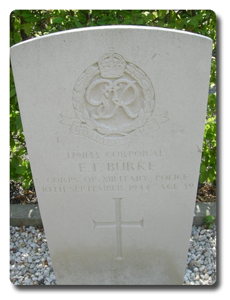 | Notes: | CMP. Enlisted in the Royal Artillery, Anti-Aircraft. 10/5/41 Transferred to CMP. 10/9/44 Died. He was born in South Africa and resided in Preston. Unit War Diary, 109 Pro Coy, CMP. WO 171/3376. 9/9/44, Ath, Belgium, 1791133 Cpl E T Burke Died suddenly from heart failure. Buried in Ath Cemetery 1/9/44. Casualty Lists 1558/32, North West Europe, Died, 10/9/1944.1/9/49 He was awarded the 1939-1945 Star, France & Germany Star, Defence Medal, War Medal.Address:- 102 Home Slack Lane, Deepdale, Preston, Lancs.No inscription on gravestone. Edward Terence Burke.Extract from the Lancashire Evening Post, 30/8/44.Corporal Edward Terence Burke, Corps of Military Police whose home is at 103 Holme Slack Lane Preston is officially reported as having in France. Corporal Burke who was 30, carried out business as hairdresser for about 12 years at 145, North Road, Preston and was president of the Preston Branch of the National Federation of Hairdressers from 1938, until he joined up about 3 1/2 years ago. He played for the Hairdressers F C. Corporal Burke leaves a widow and son. His brother, John Albert Burke is in Preston Borough Police Force. His father Lieutenant Quartermaster E T Burke was killed in France in the last war.Lancashire Evening Post 20/9/1944. Corporal Edward Terence Burke, Corps of military Police, whose home is at 100 Holme Slack Lane, Preston is officially reported as having died on active service in France. |