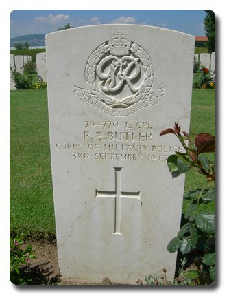 | Notes: | CMP. 14/8/1929 he enlisted in the Royal Artillery, 10/4/1936 to Army Reserve, 23/3/1940 transferred to CMP. He was born in London SE and resided in London and formerly served in the Royal Artillery. 640 Ind Pro Unit War Diary WO 169/13287. 3/9/1943 Reggio Calabria, 16.00 hrs Provost area dive bombed, bomb explosion near cookhouse, RSM Innes, Cpl Peeke, L/Cpl Butler and Pte Adams very 6 seriously injured and conveyed to RAP where L/Cpl Butler and Pte Adams Died. 17.30 hrs RSM Innes Died, 17.34 hrs Cpl Peek died. Casualty List 1243/1, Italy, Killed in Action, 3/9/1943.Medal card not found. No inscription on gravestone. Richard Ephraim Butler. |