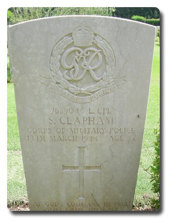 | Notes: | CMP. Enlisted in to CMP. He was born and resided in Bradford. 1 Div Pro Coy War Diary, WO 170/396. 17/3/44 Anzio, AP bombs dropped in Div HQ area, 7 casualties among personnel of section, 2 of which were fatal, L/Cpl Clapham and L/Cpl Addy. Casualty List 1410/6, Italy, Killed in Action, 17/3/1944. 5/9/49 He was awarded the 1939-1945 Star, Africa Star with 8 army clasp, Italy Star, War Medal.Address:- 2 Highthorne Avenue, Fagley, Bradford, Yorks.Inscription on gravestone: At God's command he fell, swift came the call, bidding him haste to meet his God in heaven.Stanley Clapham. |