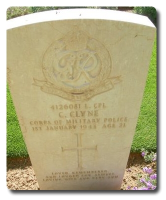 | Notes: | CMP. Enlisted in the Cheshire Regiment, transferred to CMP. He was born in Norfolk and resided in Wolverhampton. 113 Pro Coy War Diary WO 169/13256, 3/1/43 received information from Lt Richards that No. 4126081 L/Cpl Clyne C was killed by enemy mine at Sirte on 1/1/43. Casualty List 1047/3, Libya, killed in action, 1/1/1943. Medal card not found.Inscription on gravestone: Loved, remembered and longed for always, Loving wife and baby Ann. Cecil Clyne. |