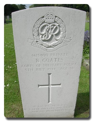 | Notes: | CMP. He was born and resided in Yorkshire and formerly served in the Duke of Wellington's Regiment transferred to CMP.Casualty List, 1508/45, Died of Wounds, Home, 5/7/1944. Inscription on gravestone:- In loving memory to a dear husband and father, always remembered.7/9/49 He was awarded the Defence Medal, War Medal.Address:- Mrs E Coates, 43 Greatwood Avenue, Skipton, Yorks.Robert Coates.Extract from the Lancaster Guardian 14/7/1944.KILLED IN LONDON. Corporal Robert Coates of the Corps of Military Police met his death in London on Wednesday of last week. Aged 37, and a native of Carlton he was well known in the Settle district, where for some years he was assistant gamekeeper to the late Col. Birkbeck of "Anley." He resided at Langliffe for a time, where he married Miss Rawsthorne of Low Fold. Removing to Skipton he was employed by Messrs. Carr, Ltd until the outbreak of war when he was mobilised with the Skipton Territorials. His widow and two young children reside at Greatwood Avenue, Skipton. The remains were brought to Skipton on Monday for the internment on Tuesday at Waltonwrays Cemetery, preceded by a service at Skipton Parish Church.Extract from the Bradford Observer - Wednesday 12 July 1944. SKIPTON FUNERAL. The funeral took place at Waltonwrays Cemetery, Skipton, yesterday of Corporal Robert Coates of Greeatwood Avenue, Skipton, whose death occurred as a result of enemy action. The interment was preceded by a service at the Parish Church conducted by the Rev. J C J Wilson. |