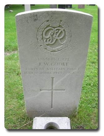 | Notes: | CMP. He was born and resided in Leicestershire and formerly served in the Leicestershire Regiment. His father 2/Lt Archibald Ernest Cooke, Leicestershire regiment was killed in action in France 1/5/1918. Casualty List 1274/18, Home, Died, 18/10/1943. 20/9/49 He was awarded the War Medal.Address:- Mrs W Wright, 74 Barbara Avenue, Leicester, Leicestershire.Inscription on gravestone: Greater love hath no man. James Walter Cooke. |