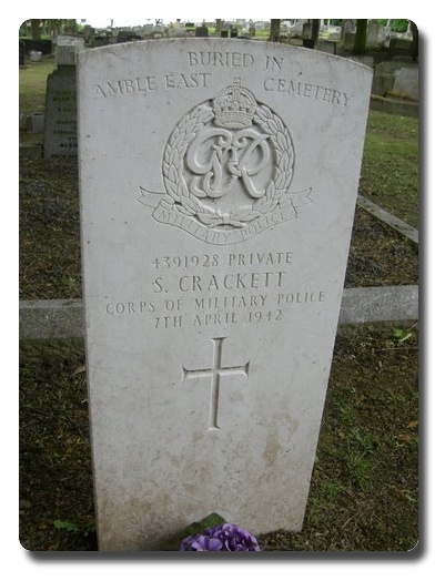 | Notes: | CMP. 16/10/39 enlisted in the Green Howards, 25/1/41 transferred to CMP. TC. 80 Coy TC. 7/4/42 Died. He was born and resided in Northumberland. War Diary 80 Coy Traffic Control, WO 166/9833. 7/4/1942 10.50 hrs information received that 4391928 Pte. Crackett A seriously injured in a motorcycle accident at Holme on Spalding Moor whilst carrying out his duties as a dispatch rider, Pte Crackett subsequently succumbed to his injuries. Casualty List 804, Home, died result of accident, 7/4/1942. 22/8/13 information from Town Clerk, Amble Town Council that this gravestone has now been re erected on his grave in the East Cemetery. Casualty List 804/22, Home, Died Result of Accident, 7/4/1942.Inscription on gravestone: Beautiful memories are all we have left, remembered by wife Emily and son Desmond.Medal card not found.Sydney Crackett. |