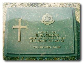 | Notes: | CMP. He was born in Oxfordshire and resided in Kent and formerly served in the Royal Artillery. He died on the same day as 14904699 Cpl. Smith R G of same unit. Casualty List 2021, Burma, Died as a result of an accident, 16/3/1946.Medal card not found.Edwin William Simons. |