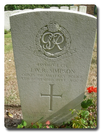 | Notes: | CMP. He was born and resided in Middlesbrough and formerly served in the Green Howards, 245 Pro Coy War Diary, WO 171/3390. 7/11/1944 St Omer, L/Cpl Simpson J W R 4388160 involved in a traffic accident with a French civilian car. 8/11/1944 L/Cpl Simpson died, 9/11/1944 L/Cpl Simpson buried. Casualty List 1615/25, Western Europe Died Result of Accident, 8/11/1944. Medal card not found.Inscription on gravestone: The memory of him will remain deep and abiding always.John William Richard Simpson. |