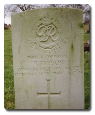 | Notes: | CMP. He was born in Durham City and resided in Leeds and enlisted in to CMP. Casualty List 366/8, Home, Died result of accident, 12/11/40.Casualty List 576/19, Home, Died as a result of an accident. 12/11/40.Medal card not found.No inscription on gravestone.Thomas Simpson. |