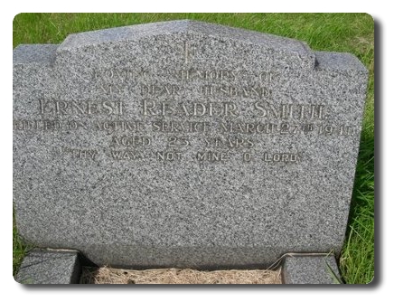 | Notes: | CMP. 13/6/40 enlisted in the North Staffordshire Regiment, 25/1/41 transferred to CMP. 28 Coy (TC). 27/3/41 Died. He was born and resided in Nottingham. War Diary, "S" Group, Traffic Control. WO 166/5861. Abergavenny, 27/3/1941. 5053527 Pte. Smith E R killed in a traffic accident. 28 Coy (TC) part of "S" Group, Traffic Control. Casualty List 480/5. Home, Died as a result of an accident, 27/3/41.7/9/49 He was awarded the Defence Medal, War Medal.Address:- Not shown.Inscription on private gravestone: In loving memory of my dear husband Ernest Reader Smith, killed on active service March 27th, 41, Age 23. Thy way not mine O'Lord. Grave has a small stone vase marked: From Officers and men of 28 Coy (TC). Ernest Reader Smith. |