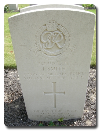 | Notes: | CMP. He was born and resided in Lancashire and formerly served in the Manchester Regiment. 247 Pro Coy War Diary WO 171/10801. 6/1/1946, Brussels, notification received at this HQ of the death of L/Cpl J Smith of this unit who died at 108 General Hospital. 7/1/1946 funeral of the late L/Cpl smith of this unit, friends given full opportunity to attend. Casualty List 1961/6, North West Europe, died as a result of an accident, 5/1/1946. 7/9/49 He was awarded the 1939-1945 Star, Africa Star with 1 army clasp, France & Germany Star, Defence Medal, War Medal.Address:- Mrs E Smith, 64 Warrington road, Glazebury, Nr. Manchester, Lancs.Inscription on gravestone: The day thou gaveth Lord is ended, the dawn leads to another day. James Smith |