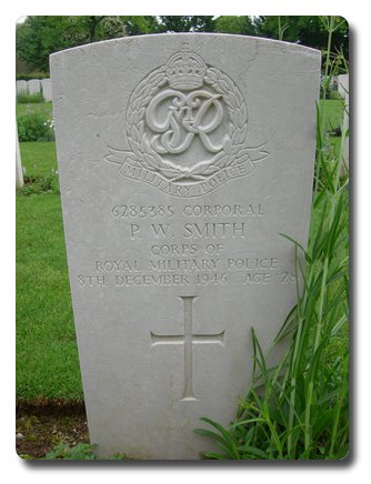| Notes: | CMP/RMP. Enlisted the the Buffs, East Kent Regiment, transferred to CMP. 8/12/46 Died. He was born and resided in Kent.28/2/50 28/2/50 He was awarded the 1919-1945 Star, War Medal.Address:- Mrs M L White, 3 The Terrace, Postling, Nr. Hythe, Kent.No inscription on gravestone. Patrick William Smith. |