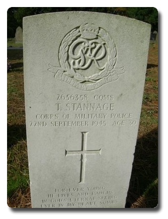 | Notes: | CMP. 15/2/1934 he enlisted in the Coldstream Guards, at Leicester in the Regular Army for 7/5 years age 18.11 years, occupation Labourer born Lambourne Nr Twyford, Leicestershire. 11/4/1936 transferred to CMP. 22/9/1945 Died. Inscription on gravestone: Forever young he lives and laughs in God's eternal spring, ever in my heart, Squibs. Casualty List 1877/5, Home, Accidentally Killed, 22/9/45.12/4/50 He was awarded the Defence Medal, War Medal, GSM 1918 Palestine.Address:- Mrs P I Stannage, c/o "Milbrook" Peters Finger, Southampton Road, Salisbury, Wilts.Thomas Stannage. |