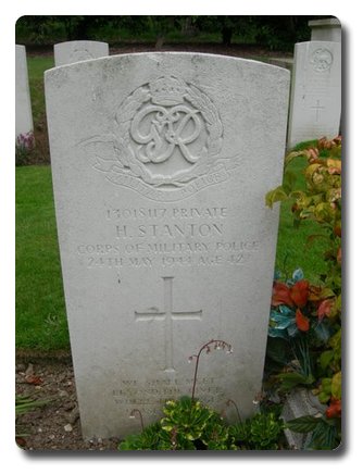 | Notes: | CMP. Formerly Pioneer Corps transferred to CMP. VP. He was born in London NW and resided in London N. Unit War Diary 335 Coy VP. CMP. WO 166/16256. 24/5/44 Southampton. Strength Decrease 1 OR (No. 13018117 Pte Stanton H died from self inflicted wounds, buried at Hollybrook Cemetery, Southampton on the 30/5/44. Casualty List 1465/28, Home, Died, 24/5/1944. 20/9/49 He was awarded the Defence Medal, War Medal.Address:- Mrs J A Stanton, 31 Dickenson Street, Kentish town, London N W 5.Inscription on gravestone: We shall meet beyond the rivers, where the surges cease to roll.Harry Stanton. |
