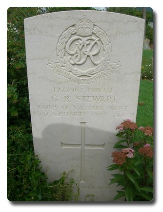 | Notes: | CMP. Enlisted in the Royal Artillery (Coast), 29/9/41 transferred to CMP. 184 Pro Coy. 23/9/44 Died. He was born and resided in Greenock. Unit War Diary 184 Pro Coy, WO 170/3575. 23/9/44 1722967 Pte Stewart G killed by explosion of landmine 14403891 L/Cpl Douglas seriously injured and evacuated to 64 General Hospital, US Army. Casualty List 1572/3, Italy, Killed in Action, 23/9/1944. Medal card not found.Inscription on gravestone: Until we meet again. George Brown Stewart. |
