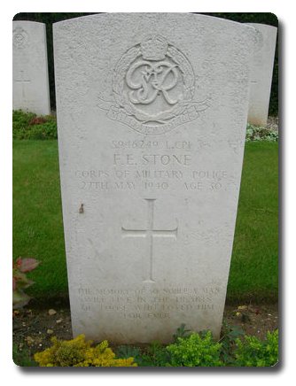 | Notes: | CMP. 5 L of C pro Coy. Enlisted in the Bedford & Hertfordshire Regiment, transferred to CMP. Casualty List 283/26, BEF, France, missing, 10/5 to 16/6/1940. Casualty List 757/1, BEF, France, Died, 27/5/40, previously on List 283 as missing, 1/5 - 16/6/40. Casualty List 839/10, BEF, France, List 757, Died, 27/5/1940, previously shown on List 283 as missing 10/5 - 16/6/1940 should read on or since 27/5/940. 79/49 He was awarded the 1939-1945 Star, War Medal.Address:- Mrs G T Stone, 37 Carlton Crescent, Cheam, Surrey.He was born and resided in London. Inscription on gravestone: In memory of so noble a man, will live in the hearts of those who love him for ever. Frederick Edward Stone. |