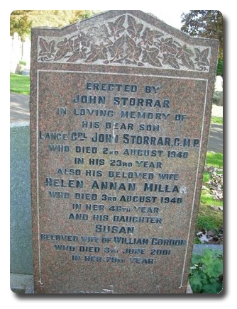 | Notes: | CMP. He was born in Kircaldy and resided in Dundee and enlisted in to CMP. Casualty List 283/51, Home, Died as a result of an accident, 2/8/1940. Casualty List 284/66, Home, Died result of a Accident (L306 deleted). Casualty List 306/32, Home, Died Result of Accident, the above entries should be deleted ( also shown on List 283, 2/8/1940 2/8/1940. Medal card not found.Inscription on private gravestone: Erected by John Storrar in loving memory of his dear son L/Cpl John Storrar, CMP who died 2nd August 1940 in his 23rd year. Killed in a traffic accident 2/8/1940.John Storrar. |
