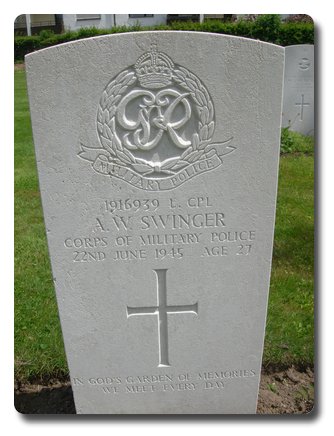 | Notes: | CMP. He was born in London SW and resided in Ipswich and formerly served in the Royal Engineers. War Diary 78 Div Pro Coy, WO 175/176. 28/11/42 7684591 Cpl Collins N CMP, 1916939 L/Cpl Swinger H, CMP at sea on "Otranto" failed to disembark + 2 REME. 78 Div Pro Coy War Diary WO 170/4403. 17/6/1945 L/Cpl Swinger involved in an accident with a German vehicle on the Mautendorf pass. 20/6/1945 L/Cpl Swinger escorted from Rastadt to Villach - leg amputated on arrival. 22/6/1945 L/Cpl Swinger died. 24/6/1945 L/Cpl Swinger buried at Spittal Military Cemetery. Casualty List 1802/4, Italy, Died result of an accident, 22/6/1945Medal card not foujnd.. Inscription on gravestone: In God' garden of memories we meet every day.Alfred Wallace Swinger. |