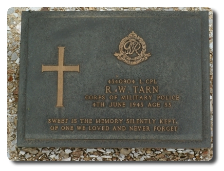 | Notes: | CMP. POW. 18 Div Pro Coy. Enlisted in the East Yorkshire Regiment, transferred to CMP. 4/6/43 Died. He was born and resided in Durham. Captured at Singapore 15/2/1942. Died From Cholera 4/6/1943 at Sonkrai, Thailand. Home address: Mrs M Tarn, 25 Victoria Street, Crook, Co Durham. Info from Japanese POW index card: Robert William Tarn, 2/7/1909 born 8 Wheat bottom, Crook, Co Durham, address: Marjorie Tarn, 25 Victoria Street, Crook, Co Durham, occupation labourer, father John Joseph.He is listed in British POW's held in Japan and Japanese Occupied Territory: 49291, Tarn, Robert William, L/Cpl, 4340904, Army, captured 15/2/1942, died 4/6/1943, camp MA, Malaya. He is listed on Malaya POW Camp Roll: Tarn, Robert William, Army, L/Cpl, new POW No. IV 10365, old POW No. i/6042, 4/6/16.He is listed on British POW who died in the Malaya POW Camp: 6. L/Cpl, Robert William Tarn, 4340904, died 4/6/1943 from Cholera. He is listed in the Burial Register No. 2 Camp, Sonkurai: 154. 4340904, L/Cpl tarn, R W, CMP, 33.Casualty List 792/9, Malaya, Missing, 15/2/1942. Casualty List 1160/11, Malaya, previously posted missing now reported POW, previous List 792, 15/2/1941. Casualty List 1176/16, Malaya, previously posted missing now reported POW, previous list 792, 16/2/1942, rank E/A/L/Cpl. Casualty List 1713/27, previously reported POW in Japanese hands now reported Died, 4/6/1943.Medal card not found.Robert William Tarn. |