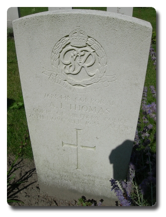 | Notes: | CMP. He was born in Monmouthshire and resided in Birmingham. 15 Div Pro Coy War Diary WO 171/476. 25/11/1944 Venray, 1 Sgt (Gadsden MM), 1 L/Cpl (Thomas) killed by enemy mines. Casualty List 1625/12 North West Europe, killed in action, 25/11/1944.9/9/49 He was awarded the 1939-1945 Star, France & Germany Star, Defence Medal, War Medal.Address:- Mrs F E Thomas, 112 Boothroyden Road, Higher Blackley, Manchester 9. Lancs.Inscription on gravestone: May he be numbered with the Saints in glory ever lasting.Alfred James Thomas. |