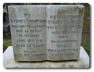 | Notes: | CMP. 16/10/39 enlisted in the Worcester Regiment, 25/1/41 transferred to CMP. TC. 16/6/41 Died. He was born in Smethwick and resided in Birmingham. Inscription on gravestone: His life a beautiful memory, Mum & Dad. Casualty List 550/10, Home Died as a result of a traffic accident, 16/6/1941.7/9/49 He was awarded the 1939-1945 Star, Defence Medal, War Medal.Address:- Mrs E Thompson, 28 Mossfield Road, King's heath, Birmingham 14. Warwickshire.,Sydney Thompson. |