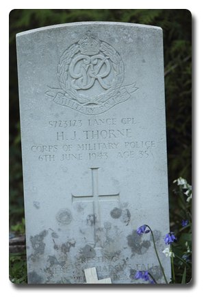 | Notes: | CMP. Enlisted in the Dorset Regiment. 22/8/40 Transferred to CMP. 55 Div Pro Coy. 6/6/43 Died. He was born in Dorset and resided in Wiltshire. Inscription on gravestone: Resting where no shadows fall, in perfect peace he waits us all. 55 Inf Div Pro Coy War Diary WO 16610668. 6/6/1943 13.40hrs 7684708 Sgt Holme, 2656564 Cpl Turner, 5723123 L/Cpl Thorne, 1554536 L/Cpl Saunders, 7686900 L/Cpl Rigby killed by enemy action air raid when Coy Billet in Eastbourne, (Hildegard, Mead Road) hit during air-raid. 4862658 L/Cpl Walker, 14258442 L/Cpl Tolson, 14256369 L/Cpl Richards injured and taken to civilian hospital. Casualty Lists 1162/13, Home Killed in Action, 6/6/1943. Medal card not found. Herbert John Thorne. |