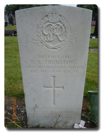 | Notes: | CMP. Died wiith the BEF in France. He was born and resided in Manchester, 31/5/40 Died. Name spelt Thrusting in Crozier Roll of Honour. His brother Edward John Thursting, 14766268, 4 Air Landing Anti-Tank Battery, Royal Artillery was killed on the Rhine Crossing on the 25/3/45 age 18, and is buried in Reichwald Forest War Cemetery, German in plot 39.a.3. Inscription on gravestone: his brother Edward John, Gunner, Royal Artillery, killed 24 March 1945, age 18 is buried in Germany. Casualty List 224/19, Home, Died of Wounds, Ex. BEF, 31/5/1940, 30.8/9/48 He was awarded the 1939-1945 Star, War Medal.Address:- Mrs V Thursting, 37 Ashton Lane, Sale, Cheshire.Francis Alan Thursting. Extract from the Birmingham Daily Post casualty list 23/6/40.Died of Wounds. Corps of Military Police, L/Cpl F A Thursting. |