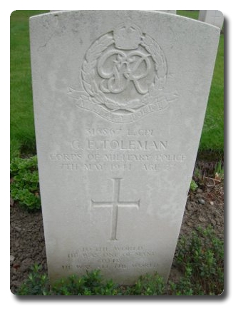 | Notes: | CMP, TC. 12/6/30 enlisted in the Cavalry of the Line, Lancers, regular army for 6/6/years, born 2/4/1914 in London. 25/1/41 transferred to CMP. 7/5/41 Died. He was born in Dorset and resided in London. He is shown as Royal Armoured Corps in Soldiers died. Inscription on gravestone: To the world he was one of many, to us he was all the world. Casualty List 279/5, BEF France, Missing, attached to Aux Military Pioneer Corps, date not reported. Casualty List 365/1, previously reported missing now not missing, attached AMPC List 279. Casualty List 554/10, CMP. Home, Died as a result of an accident, 7/5/1941.Medal card not found.George Edward Toleman. |