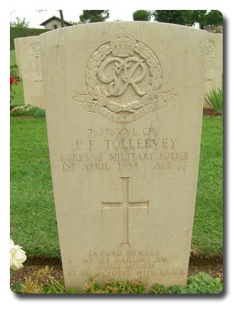 | Notes: | CMP. He was born in Suffolk and resided in Middlesex and enlisted in to CMP. 4 Div Pro Coy. 4 Div Pro Coy War Diary WO 170/424. Aqua Fondata, 1 CMP L/Cpl Killed (Tollervey), 3 wounded during enemy shelling 305117 L/Cpl Gentle, 2653458 L/Cpl, Morgan, 7691824 L/Cpl Silvester) Casualty List 1423/9, Italy, Killed in Action, 1/4/1944. 26/7/48 He was awarded the 1939-1945 Star, Africa Star, Italy Star, Defence Medal, War Medal.Address:- Not shown.Inscription on gravestone: In fond memory of my darling husband Jim, sadly missed by his devoted wire Grace.James Frank Tollervey. |