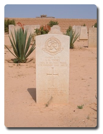 | Notes: | CMP. 13/12/40 enlisted in the Royal Artillery, 15/2/41 transferred to CMP.105 Pro Coy. 11/2/42 died. He was born in London NW and resided in Northamptonshire. Number shown as 1740195 in Army Roll of Honour. War Diary 105 Pro Coy. WO 169/6650. 12/2/42 following message received by DPM from DAPM Traffic, 8 Army. Serious accident today at Bardia junction traffic control post. 1741095 L/Cpl Tooke, Dead, 7254457 Cpl Goldsmith badly burned on both hands. 7689791 L/Cpl Madden burned on arms and face. Details will be forwarded as soon as obtained. 19/2/42 tent fire at MP post, Court of Inquiry 10.00 hrs, 20/2/42. Casualty List 764/4, Egypt, died result of accident, 11/2/42.Medal card not found.Stephen George Tooke. |