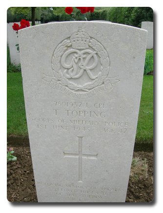 | Notes: | CMP. He was born and resided in Preston and enlisted in to CMP. 184 Company Ports War Diary WO 170/7103. Died in a road accident north of Pisa, junction route 12, 1 - 1, struck by a US 4 x 6 truck. Casualty List 1785/5, Italy, Died Result of Accident, 1/6/1945. Medal card not found.Inscription on gravestone: In loving memory of Thomas, beloved husband of May Topping. RIP.Thomas Topping. |
