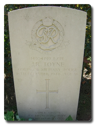 | Notes: | CMP. He was born and reside in York. 185 Coy Ports War Diary WO 171/7825: 16/12/1944 he was killed when Company HQ was hit by a V2 rocket, killing RSM Southon, L/Cpl's Acford, Bunce, Duke, Hawkins, Jones, Nisbet, Thompson and Yates. Unit War Diary 171/7825 22/5/1945 Relatives of dead received £11 collected by the Company. Casualty List 1647/15, Western Europe, Missing believed Killed, 16/12/1944. Casualty List 1656/10, Western Europe, previously reported missing believed killed now reported killed in action 16/12/1944.Medal card not found. Inscription on gravestone: Sadly missed by his wife and loving daughters Dorothy and Kathleen.James Richard Toyne. |