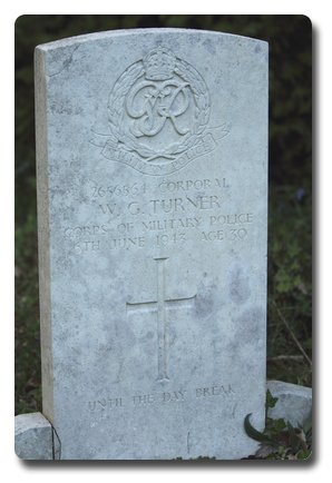 | Notes: | CMP. 55 Div Pro Coy. Enlisted in the Coldstream Guards, 7/9/1939 mobilized and transferred to CMP. 6/6/43 Died. He was born in Surrey and resided in Bournemouth. Inscription on gravestone: Until the day breaks, a small stone on the grave reads Ada Turner, Age 46. 6/6/1943 13.40 hrs 7684708 Sgt Holme, 2656564 Cpl Turner, 5723123 L/Cpl Thorne, 1554536 L/Cpl Saunders, 7686900 L/Cpl Rigby killed by enemy action air raid when Coy Billet in Eastbourne, (Hildegard, Mead Road) hit during air-raid. 4862658 L/Cpl Walker, 14258442 L/Cpl Tolson, 14256369 L/Cpl Richards injured and taken to civilian hospital. 55 Inf Div Pro Coy War Diary WO 166/10668. Casualty List 1162/13, Home Killed in Action, 6/6/1943.28/11/48 He was awarded the Defence Medal, War Medal, GSM 1918, Palestine.Address:- Not shown.Walter George Turner. |