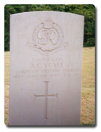| Notes: | CMP. Enlisted in the Coldstream Guards, 7/9/39, mobilized and transferred to CMP. 21/1/42 Died. He was born and resided in Somerset. 18 Div Pro Coy War Diary WO 172/84. 21/1/1942 2656702 L/Cpl Veale was killed during an air raid on Singapore. 22/1/1942 2656702 L/Cpl Veal was buried at Bindari Christian Cemetery. No inscription on gravestone. Death also mentioned in Cutts paper. Killed 21/1/1942 buried in Bindari Cemetery 22/1/1942. WO 361/2152. Home address: 8 Newman Cottages, Farnham, Aldershot. Casualty List 772/6, Malaya, killed in action, 21/1/1942.Medal card not found.He is listed in the GPO Memorial Book, Aldershot. Adrian Clarence Edric Veal.Extract from the Taunton Courier & Western Advertiser, 14/2/42.Taunton Man Killed on Active Service. Mr and Mrs A E C Veale, of the Parade Rooms, Taunton have been informed that their only son, Lance Corporal Adrian Clarence Edrich Veale, who was serving in the Corps of Military Police, was killed on active service last month. His many friends in the town will learn this news with regret, and sympathy will be extended to his wife and Mr & Mrs Veale in their great loss, Aged 27, Lance Corporal Veale attended North Town School, and on leaving served an apprenticeship at Messrs, Brakes, East Reach. He then joined the Coldstream Guards, and after completing four years service came out on reserve, obtaining Civil Service appointment as a telephonist at Aldershot Post Office. On the outbreak of war he was immediately recalled to the colours and was attached to the Military Police. He served with them in France, and was evacuated when the French Army collapsed. His wife and their young child live at Farnham, Surrey, where he made his home. His only sister, Mrs Ivan Hill, whose husband is serving in the Royal artillery, is at present staying with her parents in Taunton.(name spelt Veal in Army Records and Veale in newspaper). |