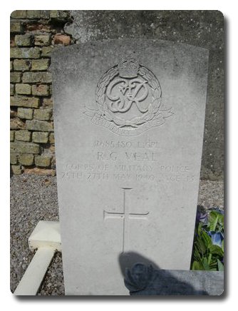 | Notes: | CMP. Enlisted in to CMP. 25/5/40 Died. He was born in Southampton and resided in Plymouth. Casualty List 240/52, BEF, France, Missing, 27/5/1940. Casualty List 922/1, BEF, France, Killed in Action, previously shown on List 240 as missing, 27/5/40, 25/25/45/40, 25/4/1940 killed in action.Medal card not found.No inscription on gravestone.Robert George Veal. |