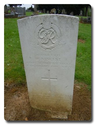 | Notes: | CMP. Enlisted in to CMP. He was born in Northamptonshire and resided in Northampton. 30/1/1944 died as a result of an accident. Casualty List 1363/20, Home, Died result of accident, 30/1/44.5/9/49 He was awarded the Defence Medal, War Medal.Address:- Mrs D M Vincent, 15 Kingsley Road, Rothwell, Nr, Kettering, Northants.Inscription on gravestone:- In loving memory of my bill who just clung to the cross and exchanged it that day for a crown. A plate set in the grave reads:- Treasured memories of Olive Mable Vincent, loving wife of William Vincent, 1907-1998, Re-United.William Vincent. |