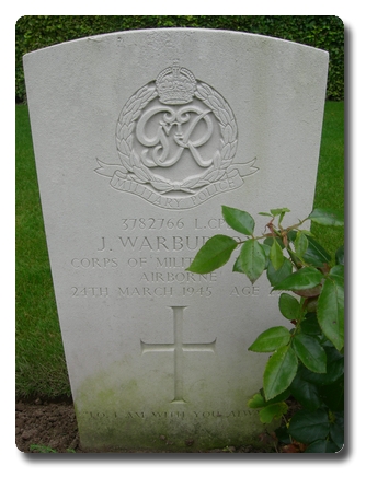 | Notes: | CMP. He was born and resided in Bolton and formerly served in the Kings Regiment. 6 Airborne Division Pro Coy War Diary WO 171/4168. 24/3/1945, 10.00 hrs Lt. Monk, Sgt Deal and 7 NCO's jumped with 5 Para Bde into action North of Wesel. L/Cpl Newall killed, Lt Monk killed, Cpl Broderick killed, L/Cpl Warburton killed, L/Cpl McGowan wounded and evacuated. Casualty List 1727/25, Western Europe, Wounded, 24/3/1945, 6 Airborne Div Pro Coy. Casualty List 1740/10, Western Europe, previously reported Missing 24/3/1945 now reported Killed in Action, 6 Airborne Div Pro Coy, previous List 1727, 24/3/1945.7/9/49 He was awarded the 1939-1945 Star, France & Germany Star, Defence Medal, War Medal.Address:- Mrs T Warburton, 5 French Grove, Davey Lever, Bolton, Lancs.Inscription on gravestone: Lo, I am with you always. James Warburton. |