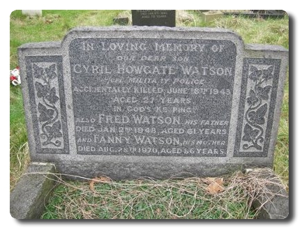 | Notes: | CMP. 27/6/40 enlisted in the Kings Own Yorkshire Light Infantry, 8/3/41 transferred to CMP. 18/6/43 Died. He was born and resided in Dewsbury . Inscription on private gravestone: In loving memory of our dear son Cyril Howgate Watson, L/Cpl, Military Police, accidentally killed January 18th 1943, age 27. In God' Keeping, also Fred Watson his father, died 2 January 1948, age 61 and Fanny Watson his mother died 28 August 1970, age 86. Casualty List 1171/17, Home, Accidentally Killed, 18/6/43.Medal card not found.Cyril Howgate Watson.Extract from the Derby Daily Telegraph, 21/6/43.Life Wasted Through Lack of Care. "It is a great pity that such a useful life should have been wasted for the lack of a seconds care" said the Derby Coroner Mr T h Bishop, recording a verdict of "Accidental death" at the inquest on Saturday into the death of Lance Corporal Cyril Howgate Watson of 51, North Park Street, Dewsbury.. Lance Corporal Watson serving with the Corps of Military Police was fatally injured on Friday afternoon when the motorcycle he was riding was in collision with a Corporation Trolley Bus at the junction of St Thomas's road and Portland Street, Derby. Driver Blameless. The coroner said that the accident was entirely due to Watson's bad riding. "It was his fault without any question" he added "no blame can be attached to the driver of the Trolley Bus." The driver of the bus, John Douglas Strange of 43 Little Over Lane, Derby said that coming down St Thomas' Lane his speed reached about 15 mph. He then shut off the current and coasted as he approached the junction. He was near the corner when he saw the motorcyclist coming at a fair speed. Broadside Collision. It seemed obvious that he was not going to stop and he (Strange) braked hard and swerved to the offside. The motorcycle came across the front of the but and hit it broadside on. When he got out he found Watson and the motorcycle underneath the front of the bus. Ignored Halt. An eye witness Mrs Doreen Williams of 154 St Thomas's Road, Derby said that the motorcyclist did not slacken speed or stop at the halt sign as he approached the junction. A passenger on the bus Mrs Hanna Pipes, of 218 Station Road, Melbourne also stated that Watson did not reduce speed and ignored the halt sign. The cause of death was stated to be a fractured skull and injuries to the body. |