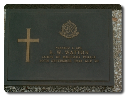 | Notes: | CMP. POW. Enlisted in to CMP. 18 Div Pro Coy. He was born in Bournemouth and resided in Southampton. Captured Singapore 15/2/1942. Died from Beri Beri and Malaria 20/9/1943 at Tambaya, Burma. Home address: 18 Stourfield Road, Pokesdown, Bournemouth.Info from Japanese POW index card: Reginald Watton, 29/3/1913 born Pokesdown, Bournemouth, address: Harry Watton, 18 Stourfield Road, Pokesdown, Bournemouth, occupation Clerk, father Harry, mother Gladys.He is listed on British POW's held in Japan and Japanese Occupied Territory: 53147. Watton, Reginald W, L/Cpl, 7686872, Army, captured 15/2/1942, died 20/9/1943, Camp MA, Malaya, deceased. He is listed on Malaya POW Camp Roll: Watton, Reginald, Army, L/Cpl. new POW No. IV 11096, old POW No. i/6431, 7686872, 29/9/1? He is listed on Thailand Death Register: 81. 7686872, Watton, R, L/Cpl, Provost Corps 18 Div, died 20/9/1943 from Malaria and Beri Beri, B17, Sonkrai, Kanchanaburi Hospital, Thailand, Force "F".Casualty List 792/9, Malaya, Missing, 15/2/1942. Casualty List 1166,/5 Malaya, previously reported Missing now reported POW, previous List 792, 15/2/1942. Casualty List 1930/14, POW, previously reported POW now reported died, died 20/9/1943, previous List 1166, Dutch East Indies.20/9/49 He was awarded the 1939-1945 Star, Pacific Star, War Medal.Address:- Mr H Watton, 18 Stourfield Road, Pokesdown, Bournemouth, Hants.No inscription on gravestone.Reginald Wilfred Watton. |