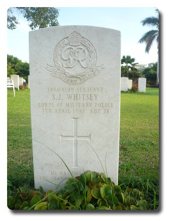 | Notes: | CMP/SIB. He was born and resided in London SW. Police Review 11/5/1945. Metro News. Roll of Honour, PC Whitsey (CID) (C). Sergeant Corps of Military Police, Killed in Action. He was travelling in an RAF Expeditor MK1 (a US twin engine Beech C-45) serial No. KH 483 of 233 Group Communications Flight, Air Command South East Asia, which took off from Peshawar at 10.30hrs, 7/12/1945 to Lahore for a Masonic Dinner when the aircraft struck a tree at high speed in bad visibility. At the time of the crash there were turbulent cumuliform clouds, it was raining and there was a strong wind. The signal warning of this bad weather did not reach Peshawar in time to prevent Expeditor KJ 483 taking off. (Info from RAF Historical Branch). It crashed 31 miles NNE of Jhelum. The following were also killed; Lieut W R Wicks, Indian Engineers, Maj C V M Inward, Royal West Kent Regiment, Maj F H Lewis, Royal Corps of Signals, Capt R M Booth, Duke of Cornwall's Light Infantry, Warrant Officer (Pilot) P H Watson, RAFVR, Flight Sergeant (Navigator) A J Robertson, RAFVR. All were originally buried at Jhelum which was an RAF airstrip. Casualty List 1742/1, Burma, Killed in Action, 7/4/1945, L 1852 Died Result of Accident. L1852 died result of accident.Casualty List 1852/18, corrections, Burma, previous List 1742, Killed in Action 7/4/1945 should read India, Died Result of Accident, 7/4/45.5/9/49 He was awarded the 1939-1945 Star, Burma Star, Defence Medal, War Medal.Address:- Mrs K H M Whitsey, 172 The High, Streatham High road, Streatham, London SW 16.Info from Croydon Roll of Honour Book. Born Streatham 23/3/1917, address: 12 Sunridge Road Streatham, education Grammar School, occupation CID Detective, Metropolitan Police he was a member of the Surrey Arts Lodge, Croydon and the Masonic Club Peshawar.Inacription on gravestone:- He has out soared the shadow of our night.Sidney James Whitsey. |