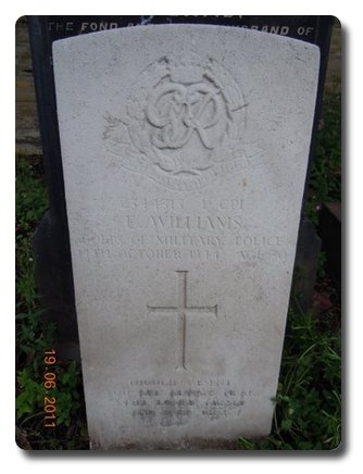 | Notes: | CMP. He was born and resided in Yorkshire and formerly served in the Royal Signals. Casualty List 1584/33, Home, Died, 14/10/1944.Medal card not found Inscription on gravestone which is a CWGC stone in a family plot: Though absent you are near. Still loved, missed and ever dear. Behind his stone is a family gravestone, part of which reads: Also William their beloved son, killed in France July 31st 1917, aged 34 years. Also David their beloved son killed in France August 29th 1918, aged 30 years. Also Edward Williams, killed in France, November 30th 1917, aged 22 years, in God's keeping.Edmond Williams. |