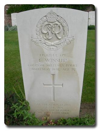 | Notes: | CMP. 13/6/39 enlisted in the Durham Light Infantry, 25/1/41 transferred to CMP. TC. 20/5/45 Died. He was born and resided in Durham. War Diary WO 171/786 247 Pro Coy. 20/5/45 L/Cpl Winship found dead in roadway having died from multiple injuries sustained through being knocked down or thrown from an American lorry. Enquiries initiated to trace perpetrator. 7/6/45 all cash the property of L/Cpl Winship (deceased) formerly NCO of this company handed over to the DPM for the necessary disposal. Personal letter sent to his wife and a cheque to the value of £25 as a result of voluntary subscription within the unit. War Diary WO 171/17813 86 Section SIB. 21/5/45 information from Lille detachment investigating alleged murder of L/Cpl Winship, 247 Pro Coy, CMP by 2 coloured USA soldiers 23.00 hrs 20th inst. Casualty List 1782/7, Western Europe, Died Result of Accident, 20/5/1945. Medal card not found. Inscription on gravestone: At the going down of the sun and in the morning, we will remember. Ernest Winship. |