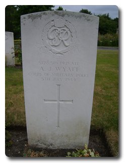| Notes: | CMP. He was born and resided in Bristol and formerly served in the Gloucestershire Regiment transferred to CMP.Casualty List, 1508/45, Died of Wounds, Home, 5/7/1944. Medal card not found.No inscription on gravestone.Albert John Wyatt. |